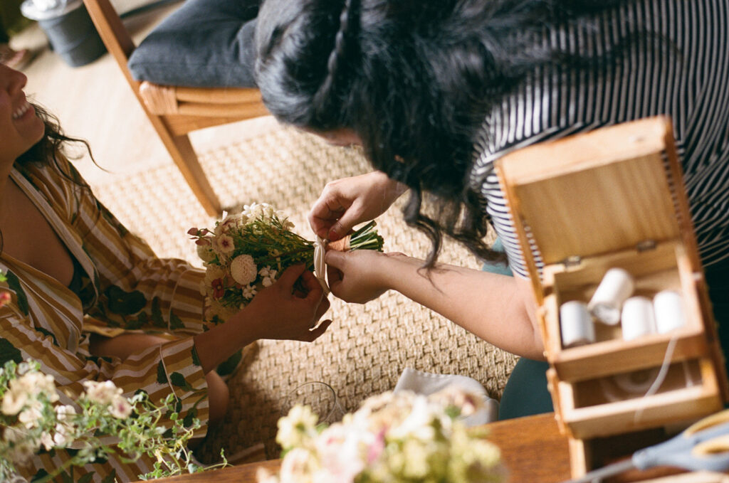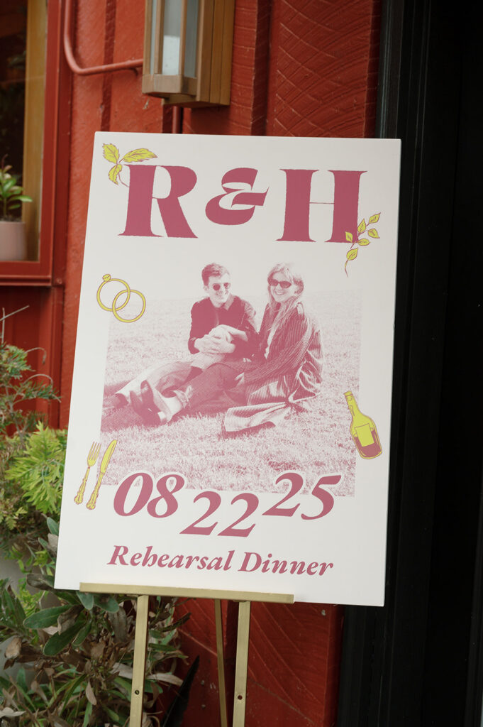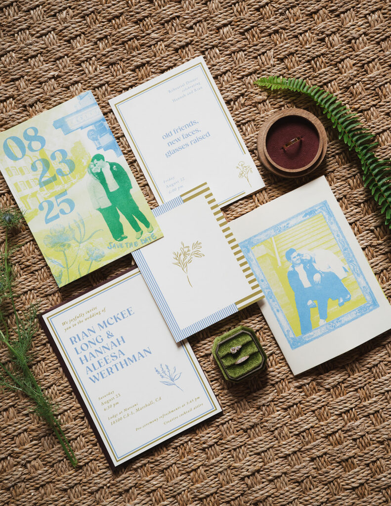 Rian, a designer, created nearly every piece of printed material for the day. The invitation suite was especially memorable: a custom risograph printed zine featuring childhood photos, stories about their relationship, and other mementos.