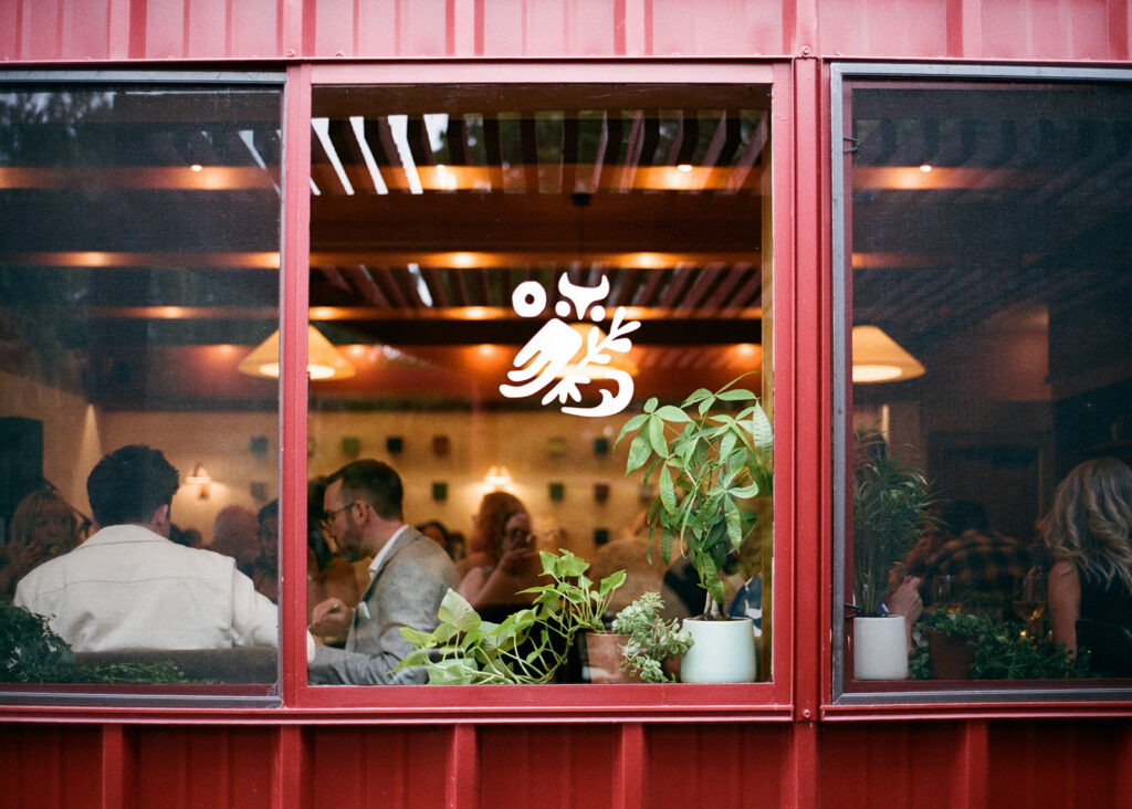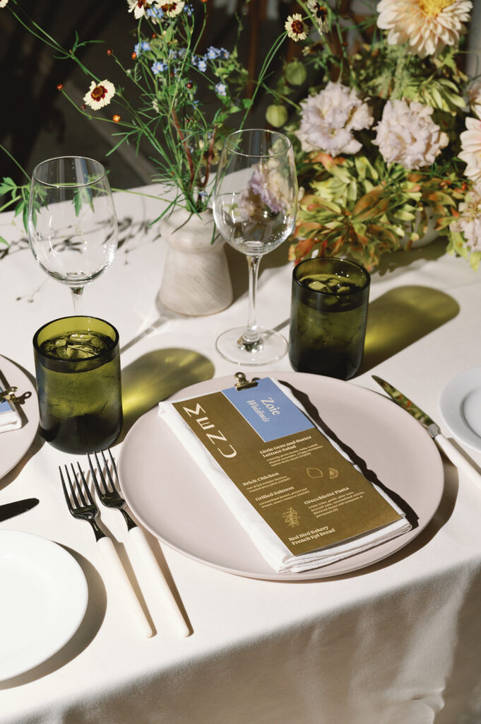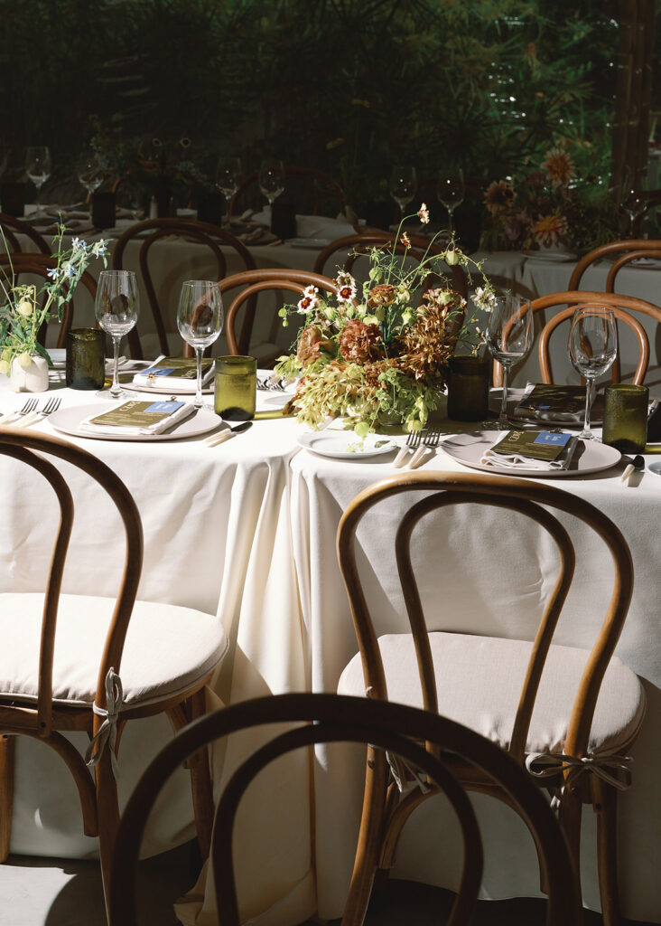 From menus and signage to coasters, candles, matches, and design elements throughout the space, every detail felt cohesive, intentional, and deeply personal. The florals perfectly reflected the surrounding landscape. Wild, abundant arrangements filled the tables with color and movement, creating an atmosphere that felt natural and effortless rather than overly formal.